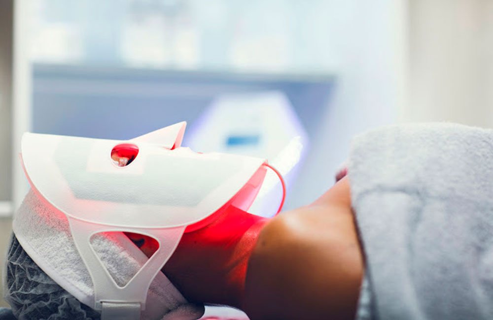 Foto Mask LED. Se usa una lámpara con forma de máscara que emite luz LED para regenerar el tejido de la zona donde se aplica. Al estimular la producción de colágeno, la piel se nutre con células propias y mejora su apariencia.